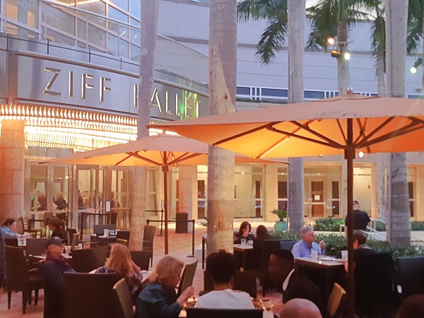 As the evening sun turned the city skyline pink and the palm fringed streets black, we made our way across the courtyard Ziff Ballet Opera House the for a pre-show dinner in the Café at Book & Books which as its name suggests is an arts bookshop by day. Not cheap but there’s a great buzz with a delicious menu of local and sustainable produce. We enjoyed a starter of ‘Local Mahi Mahi Ceviche’ followed by ‘Grilled egg-plant and Quinoa Chop Chop’ and the ‘Chorrasco Skirt Steak Chimichurri’. The cafe was packed both the outdoor tables in front of the centre and round the bar in the bookshop itself. Probably worth booking in advance to be sure of a seat.